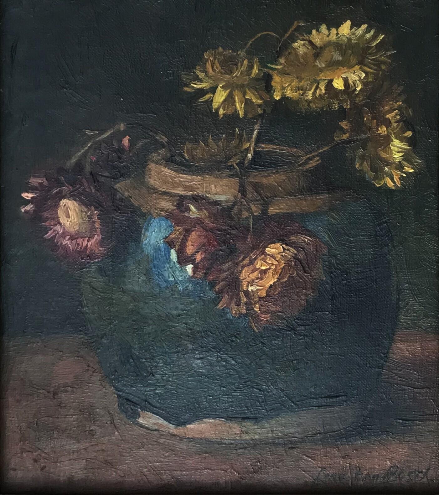 Bloemen in een glazen vaas in een nis