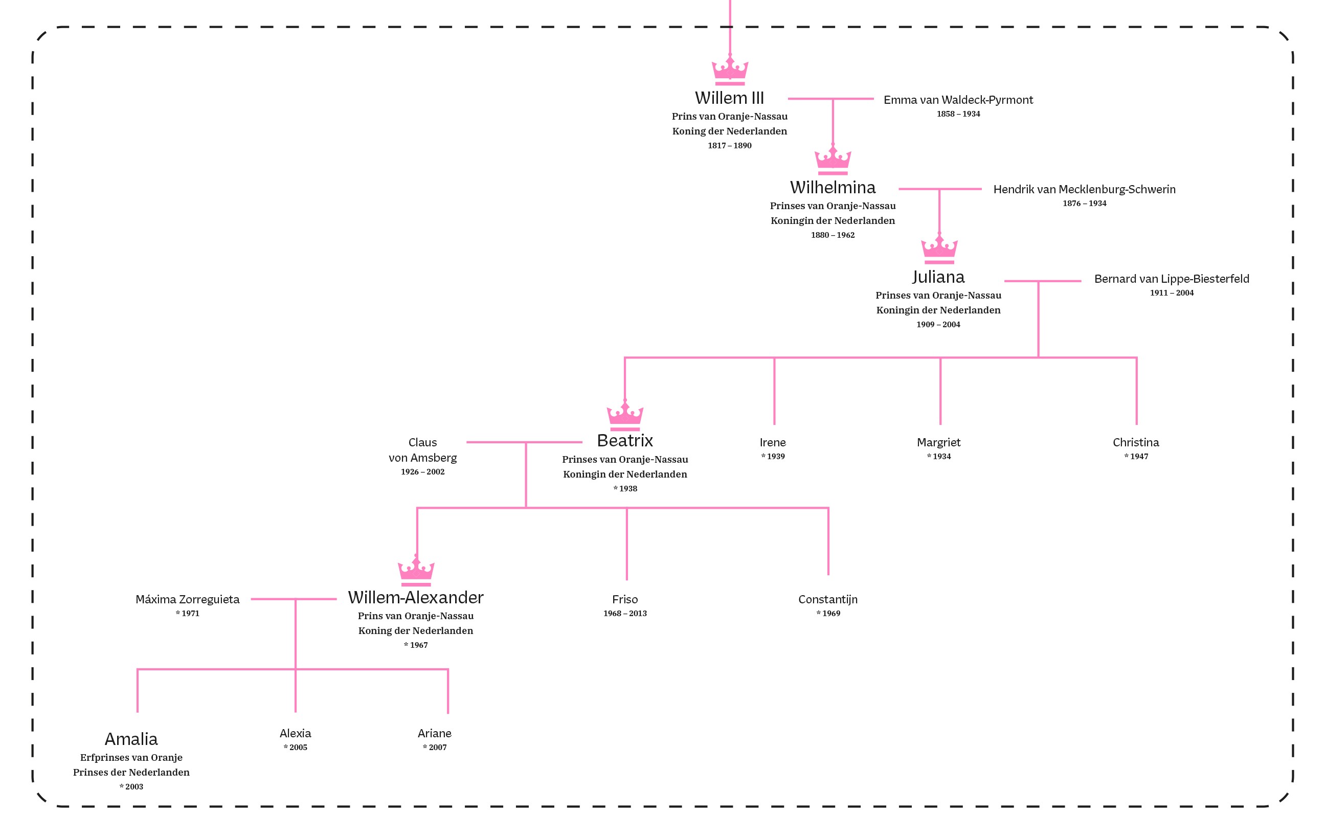 Fragment van de stamboom van het Huis van Oranje-Nassau — Download de hele stamboom als PDF. Ook om uit te printen.