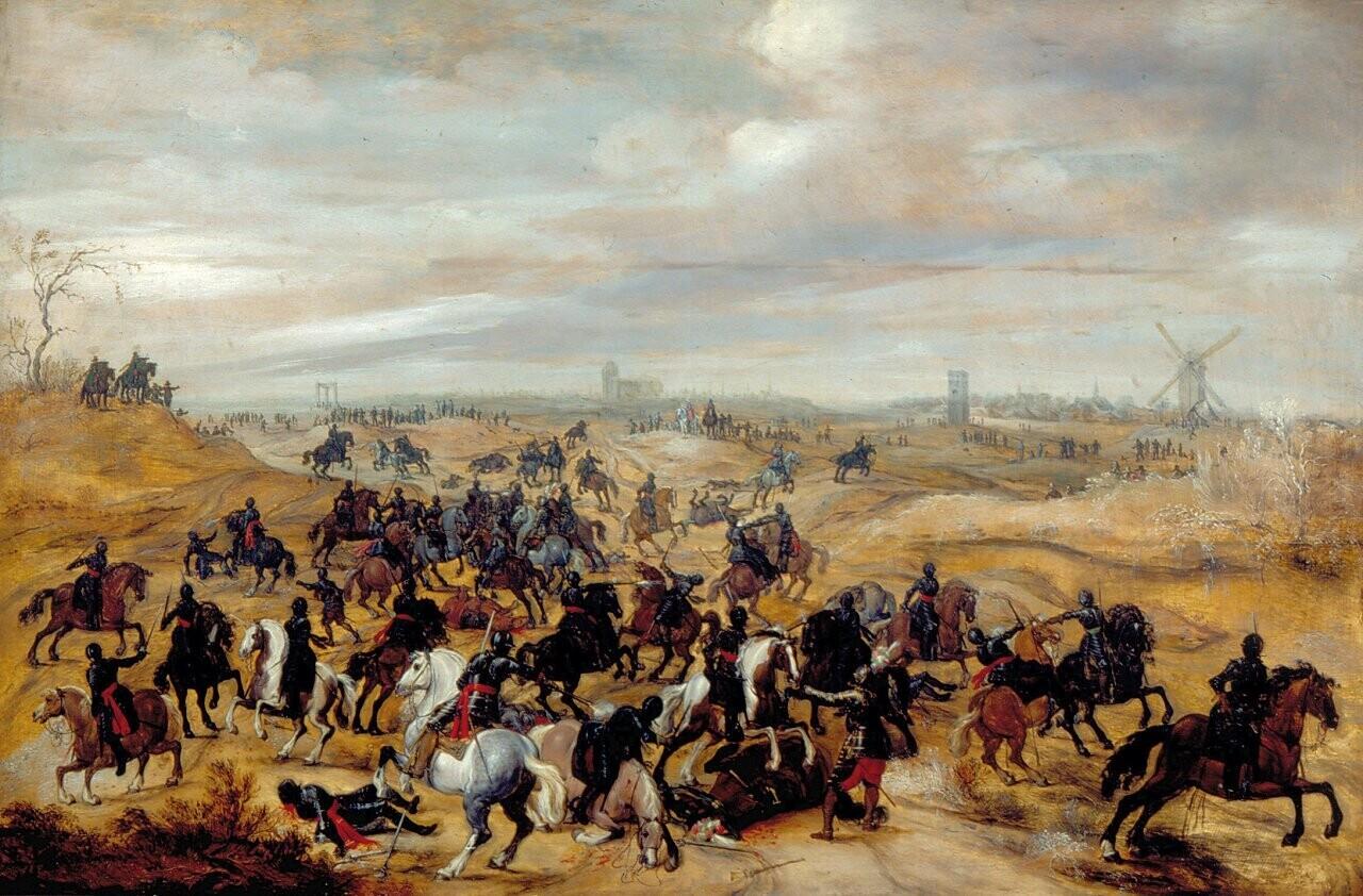 op voorgrond geharnaste ridders te paard met elkaar vechtend; op achtergrond resp. galg, kerk toren en standerdmolen.