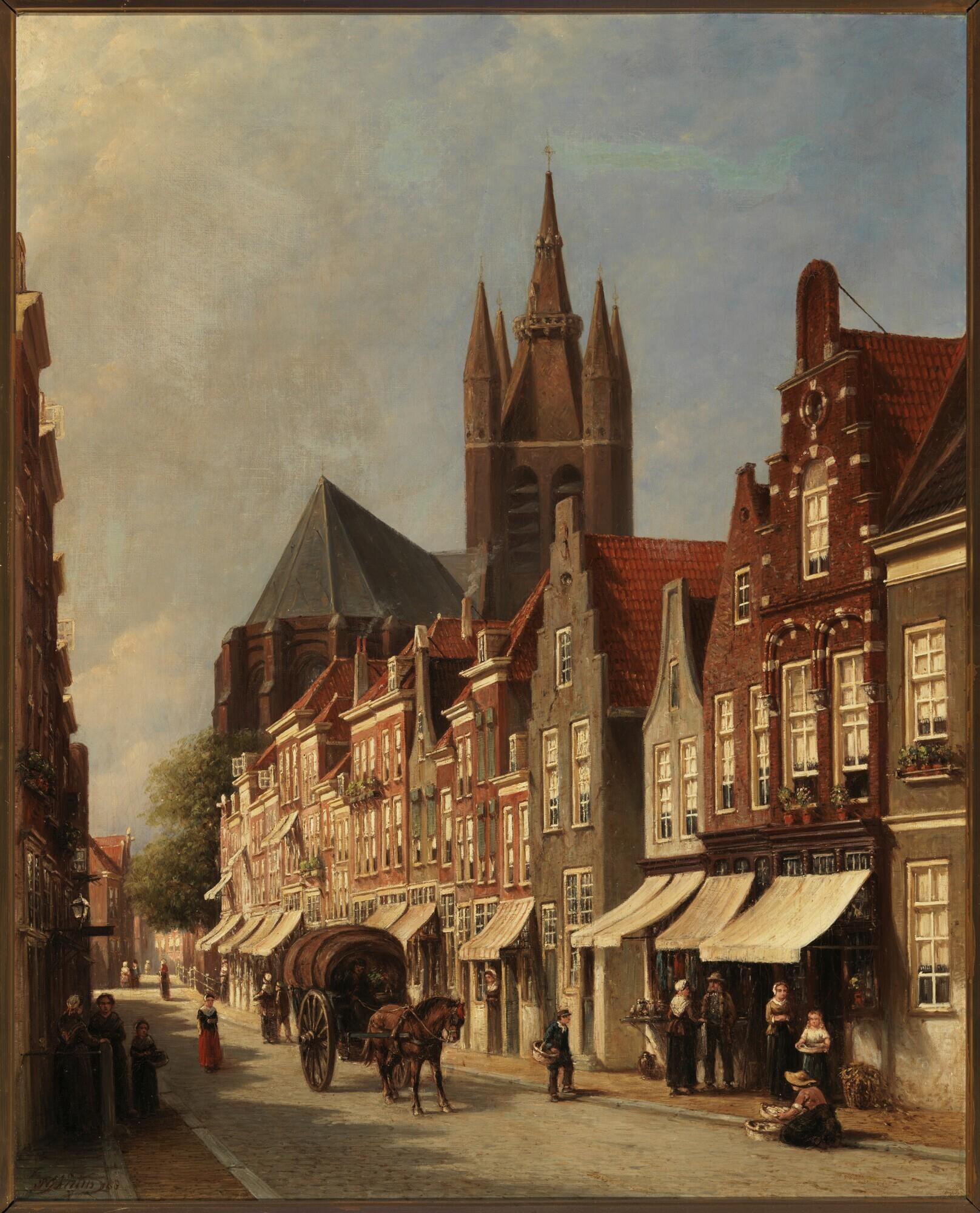 Gezicht op de Choorstraat gezien vanuit noordoosten, met paard en wagen, huifkar, winkels met luifels en op de achtergrond de Oude Kerk.