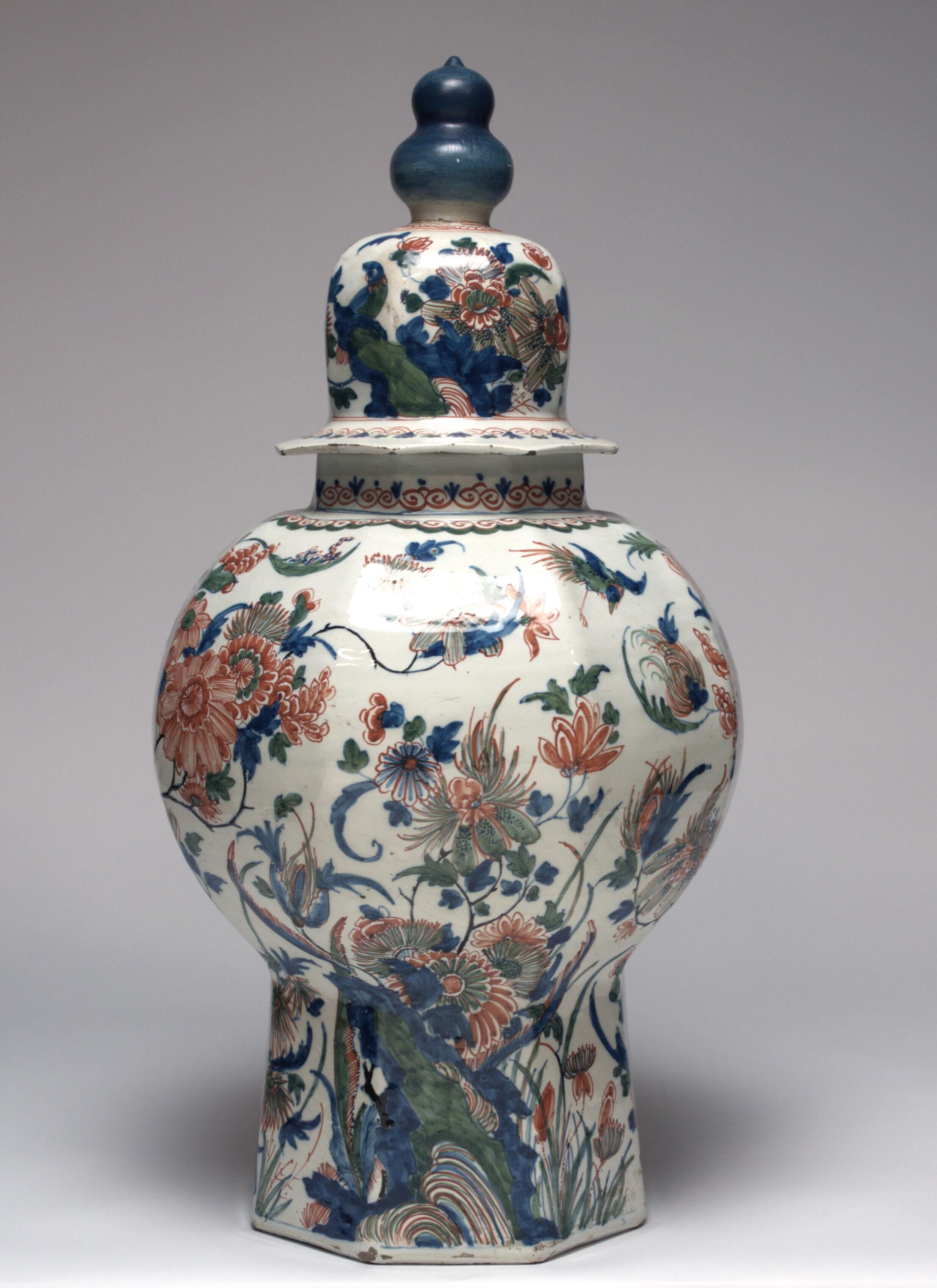 De achtkantige balustervormige pot, met hoog koepelvormig, invallend deksel met overschietende kraag en houten kalebasvormige knop, verjongt zich naar onderen toe in een hoge voet en is gedecoreerd met een oosterse voorstelling met rotsen, vogels,...