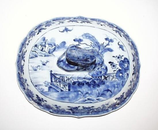 Het ovale terrinedeksel is gewelfd en heeft een golfvormige knop. Het deksel heeft een decor van een rivierlandschap, een terras met een hek met swastikapatronen, huizen, rotsen, een bloeiende plant, lingzhi's en vliegende vogels. De rand is gedec...