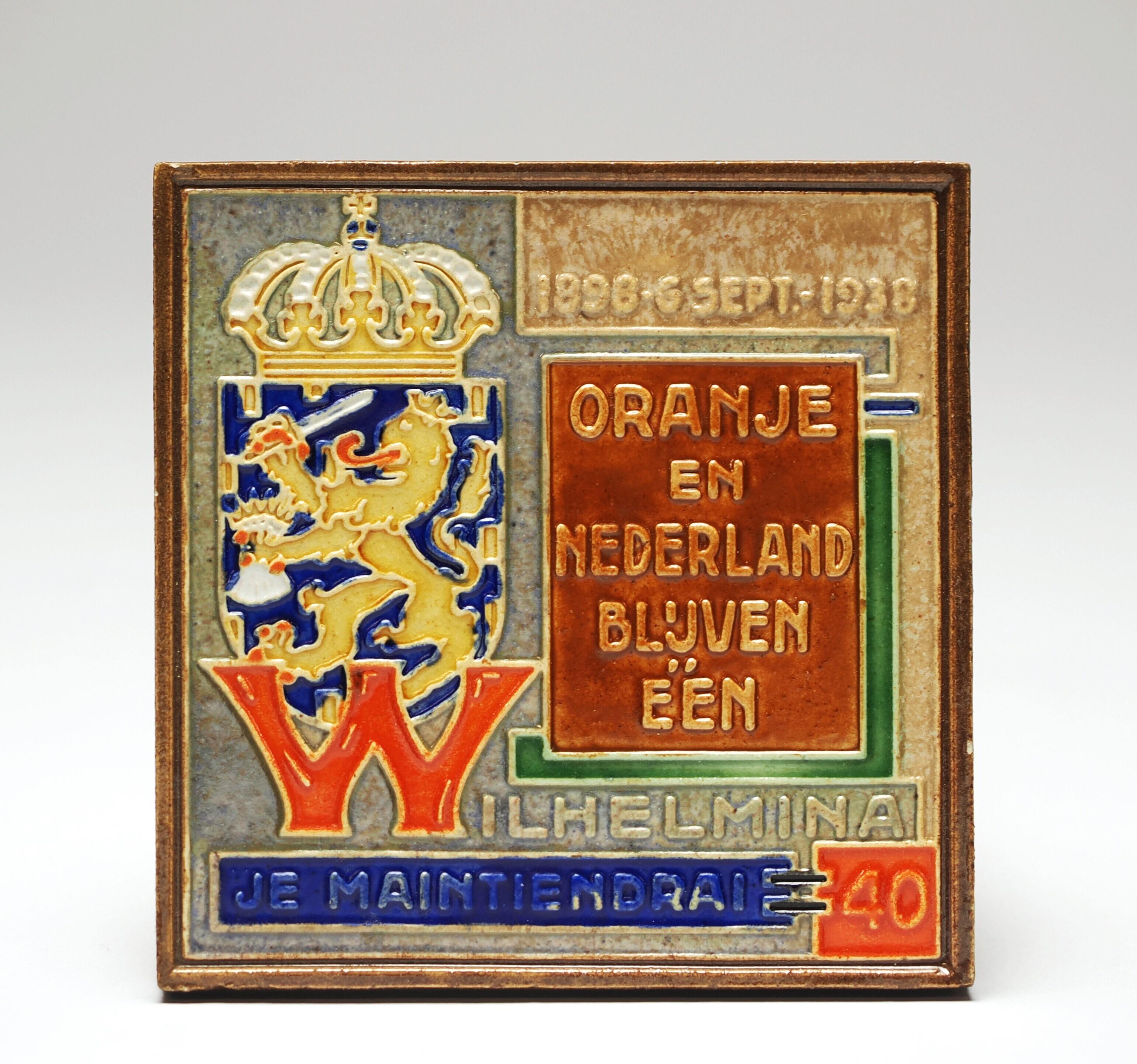 Cloisonnée tegel ter gelegenheid van het 40-jarig regeringsjubileum van koningin Wilhelmina in 1938. Aan de voorzijde is de Nederlandse leeuw afgebeeld en het opschrift 1898 - 6 sept. - 1938 Oranje en Nederland blijven één Wilhelmina Je Maintiendr...