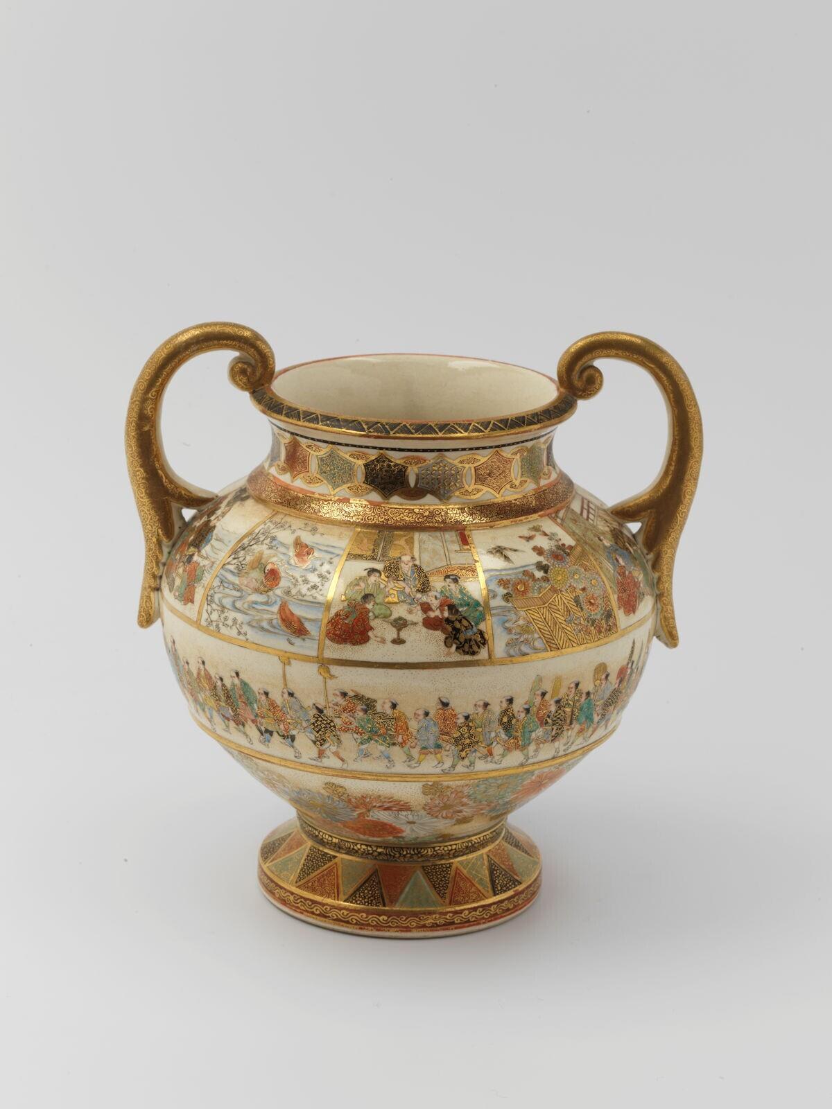 - porselein, decoratie in Satsuma-techniek in wit, geel, blauw, groen, roze, rood, bruin, zwart en goud