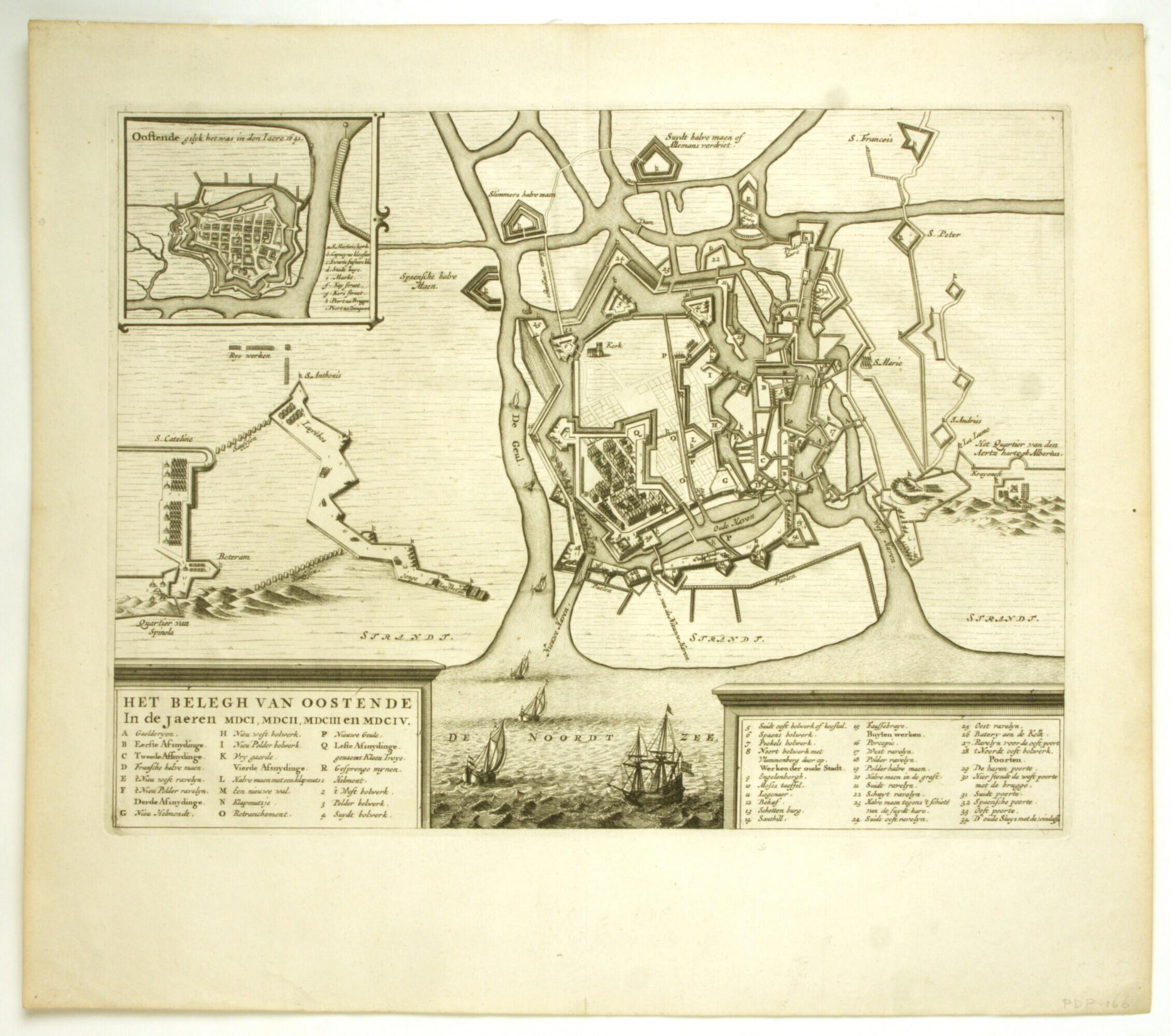 Beleg van Oostende. Kaart van de verdedigings- en aanvalslinies rondom de stad en in omliggend gebied, links het kwartier van Spinola, rechts het kwartier van aartshertog Albrecht. Onderaan twee cartouches met de titel en de legenda's A-R en 1-34....