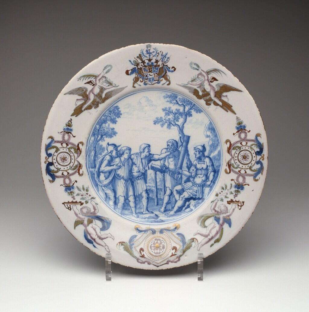 Bord op het plat in blauw beschilderd met een scène uit het leven van paus Leo X, 'Samenzweerders worden gestraft'.