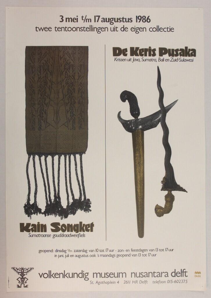 - Affiche van twee tentoonstellingen (uit eigen collectie) 'Kain Songket, Sumatraanse gouddraadweefsels' en 'De Keris Pusaka, Krissen uit Java, Sumatra, Bali en Zuid-Sulawesi', 3 mei t/m 17 augustus 1987