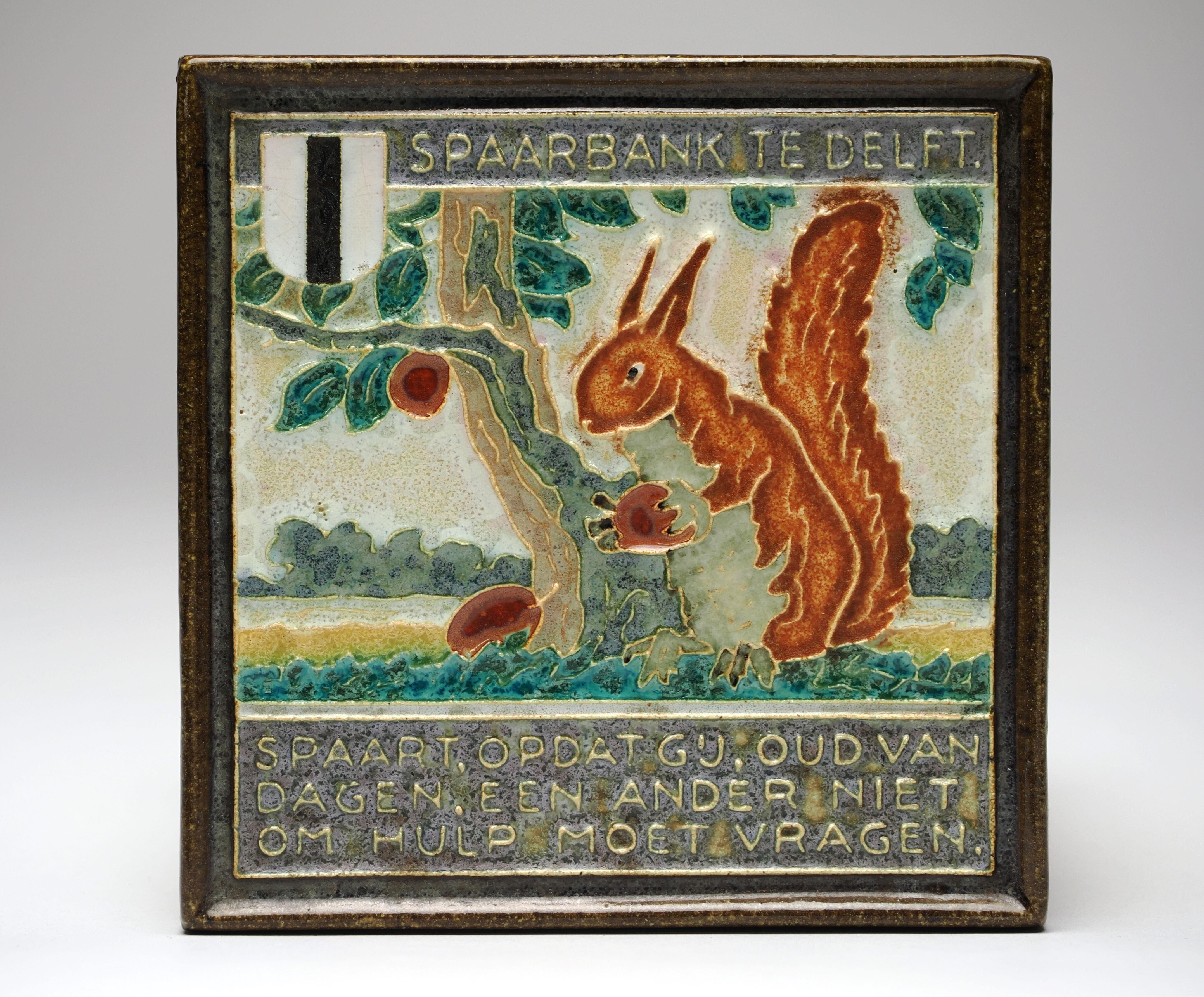 Cloisonné tegel 'Spaarbank te Delft', 'Spaart opdat gij, oud van dagen, een ander niet om hulp moet vragen'