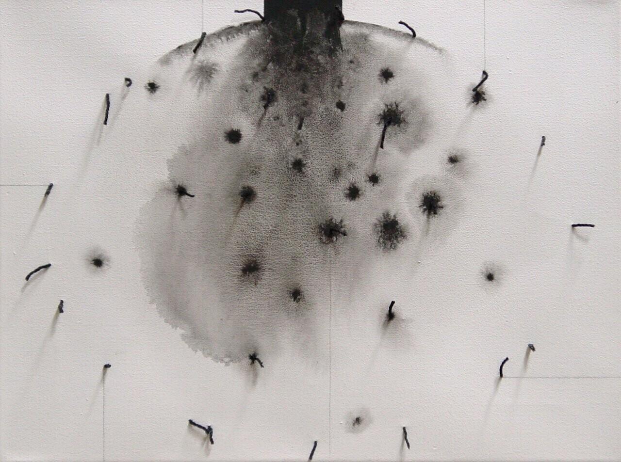 - potlood, wol, perforaties, siliconenkit, caseïneverf