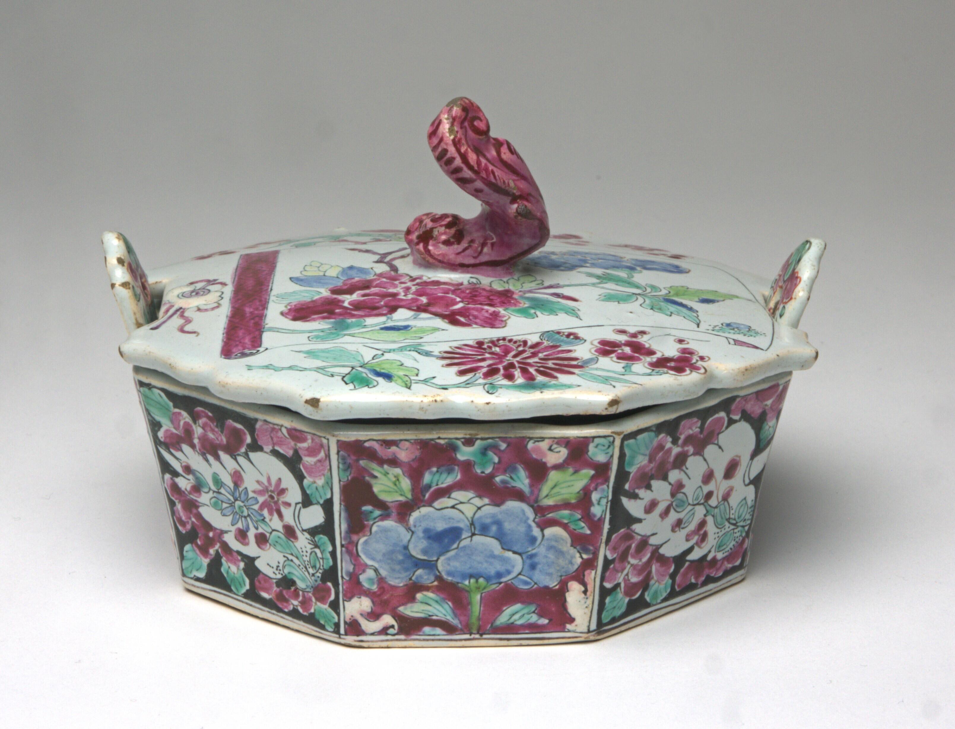 Achtkantige botervloot voorzien van twee oren en een vlak deksel met krullend acanthus blad als knop en geaccoleerde rand. De vlakken van de wanden zijn alternerend versierd met bladeren en bloemen. Op het deksel is een banderol met chrysanten, om...