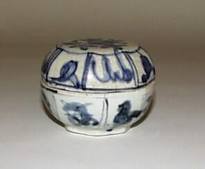 Het dekselpotje is achtkantig van vorm en heeft een standring. Het deksel heeft, binnen een cirkel, een centraal bloemdecor. De rand heeft gestileerde decoraties tussen dubbele balken. De buitenwand van het potje heeft floraaldecors tussen dubbele...