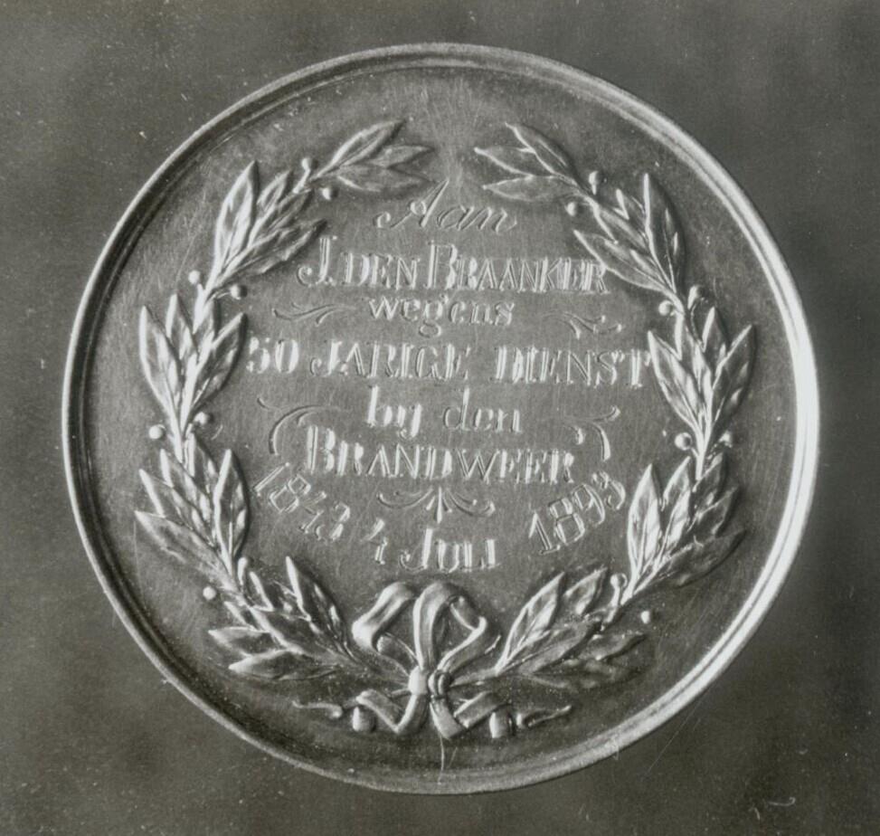 - Erepenning op 50-jarig jubileum van J. den Braanker bij de Delftse brandweer 1843-1893