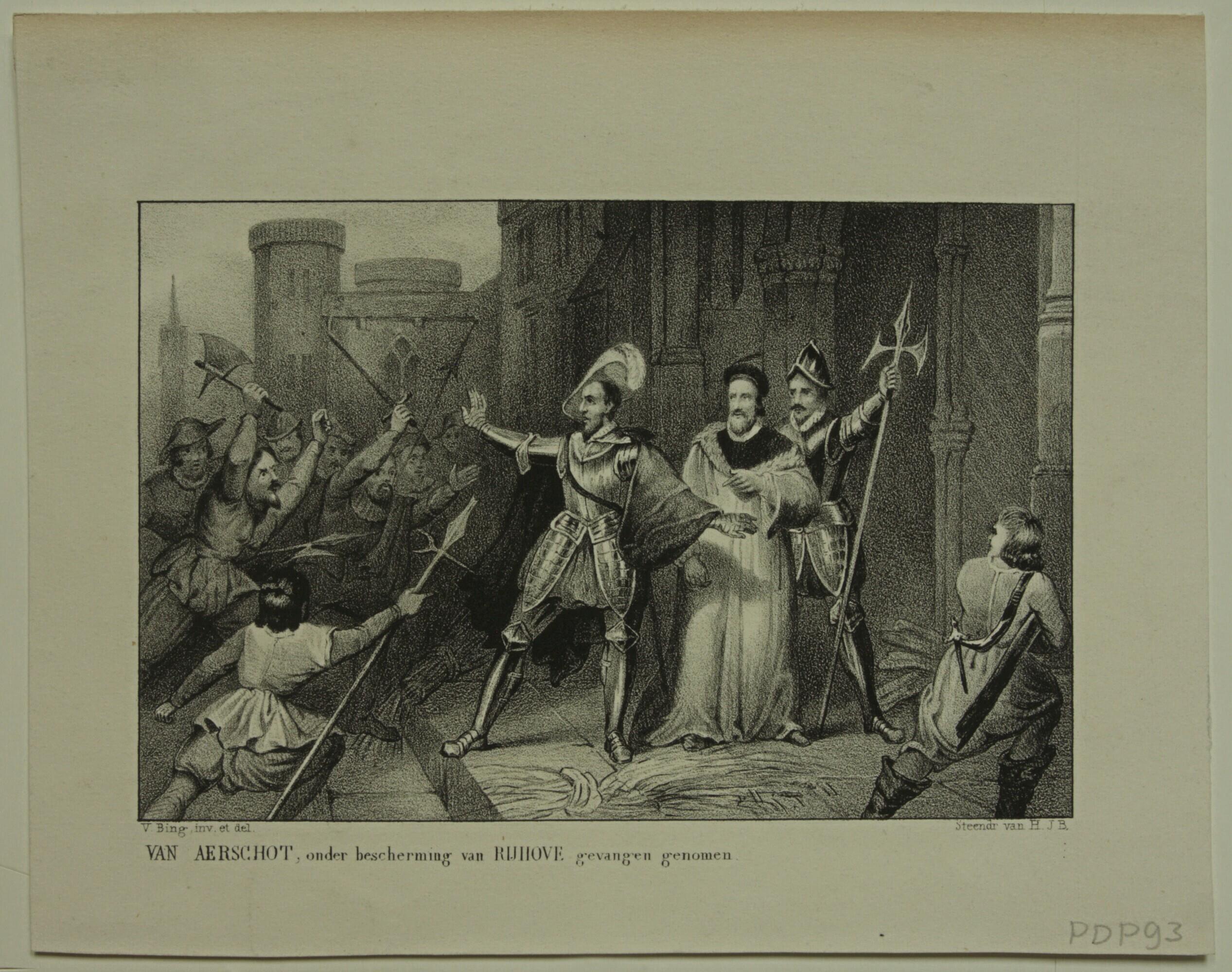 De gevangenneming van de hertog van Aarschot te Gent, 28 oktober 1577. De hertog wordt beschermd tegen de woedende menigte door François van Ryhove