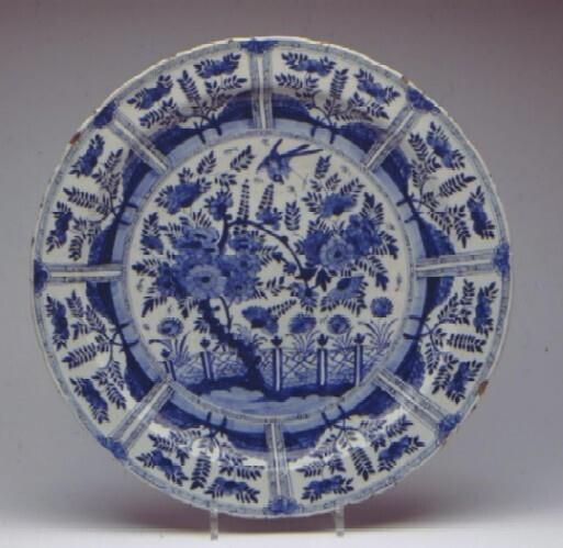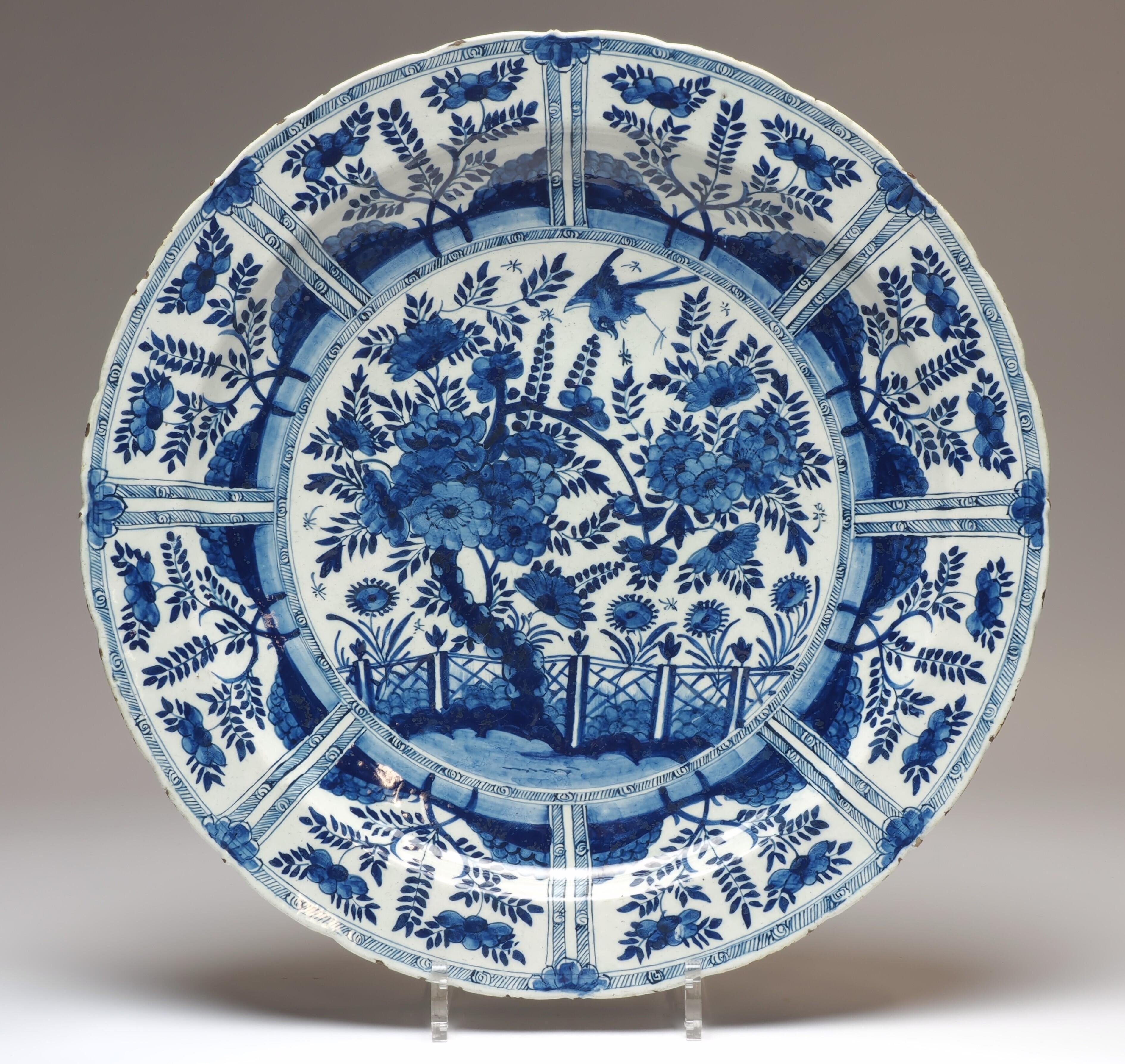 De schotel is aan de achterkant voorzien van een standring en beschilderd met drie concentrische cirkels. Op het plat aan de voorkant is een bloeiende boom voor een hek afgebeeld, met hierboven een vogel. De decoratie op de rand loopt door in het ...