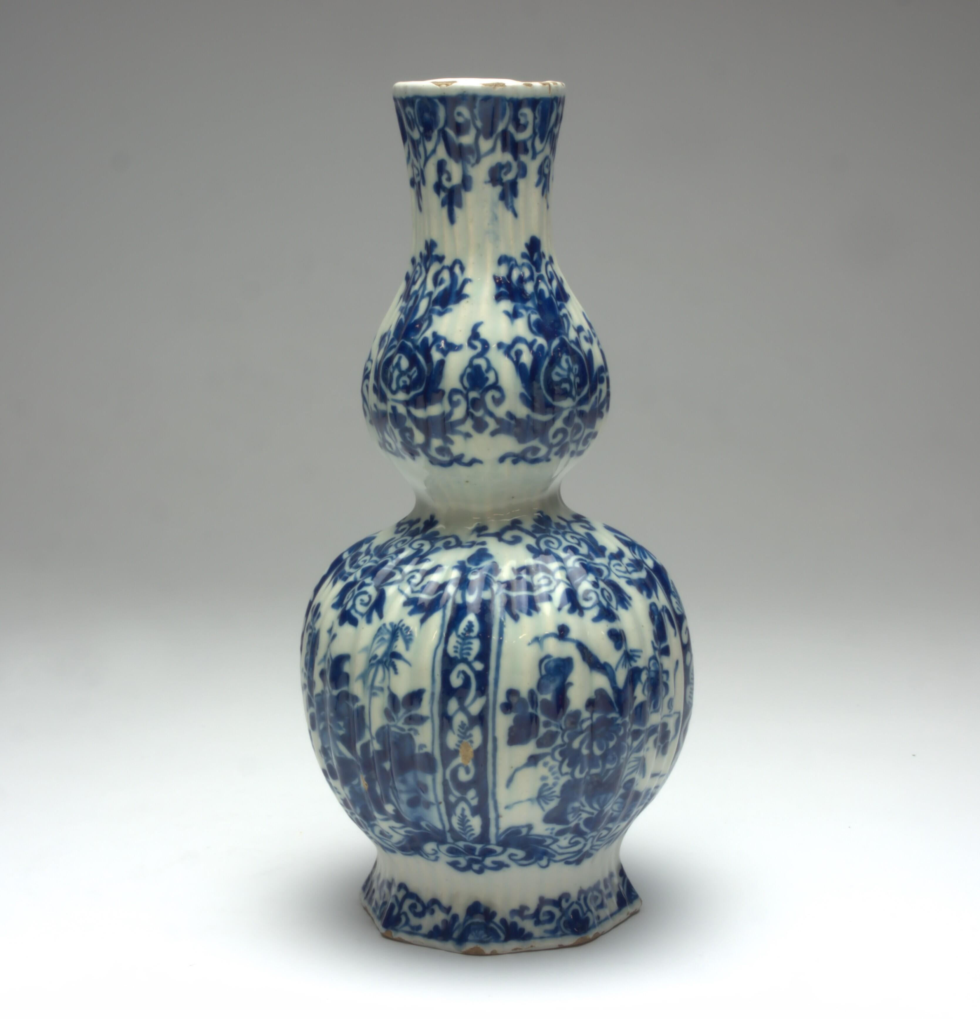 De buik van de kalebasvormige geribde fles is beschilderd met bloemen in rechthoekige panelen. De schouder is versierd met bloemen en ranken. Ook de hals is versierd met bloemen en ranken.