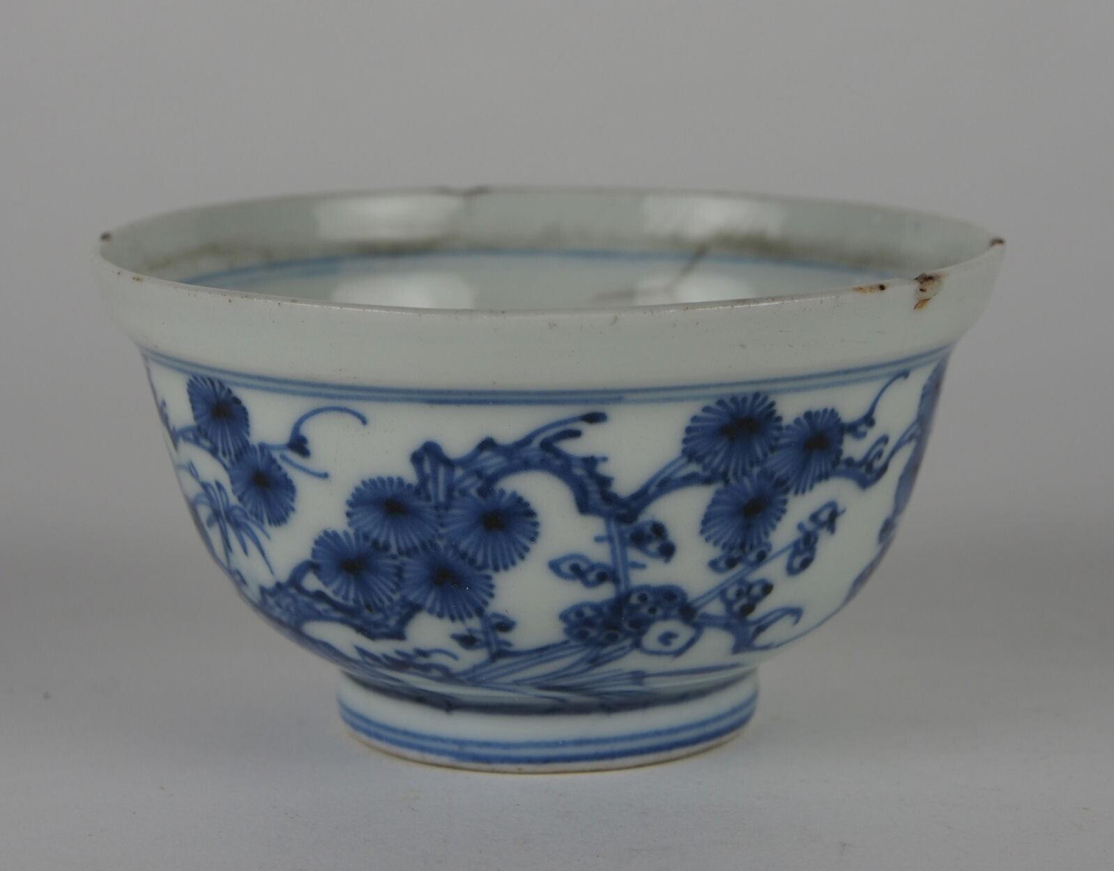 De theekom is omgekeerd klokvormig en heeft een standring en een opstaande rand met lip?. Het deksel is gewelfd en heeft als knop een omgekeerd conische ring. De kom en het deksel zijn gedecoreerd met bamboe, prunus en pijnboom, de zogenoemde 'dri...
