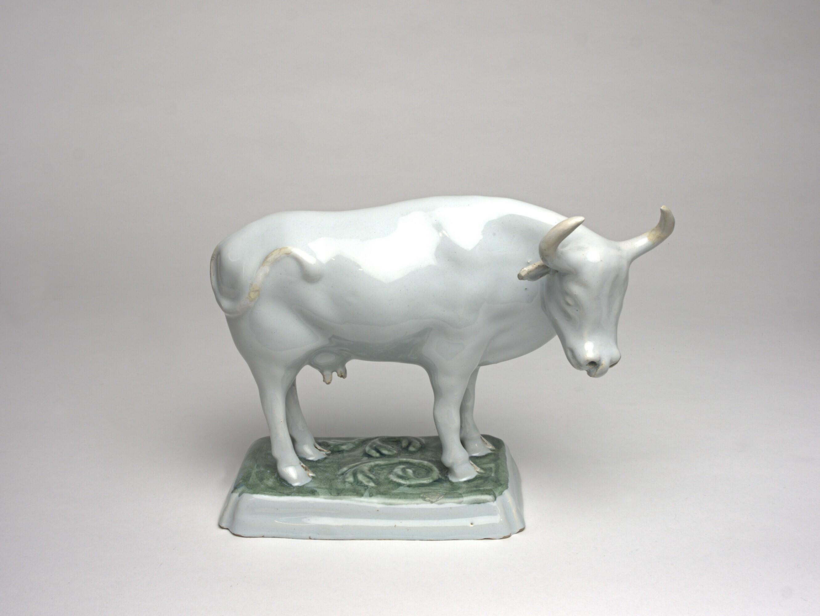 Plastiek van tinglazuuraardewerk, voorstellende een koe
