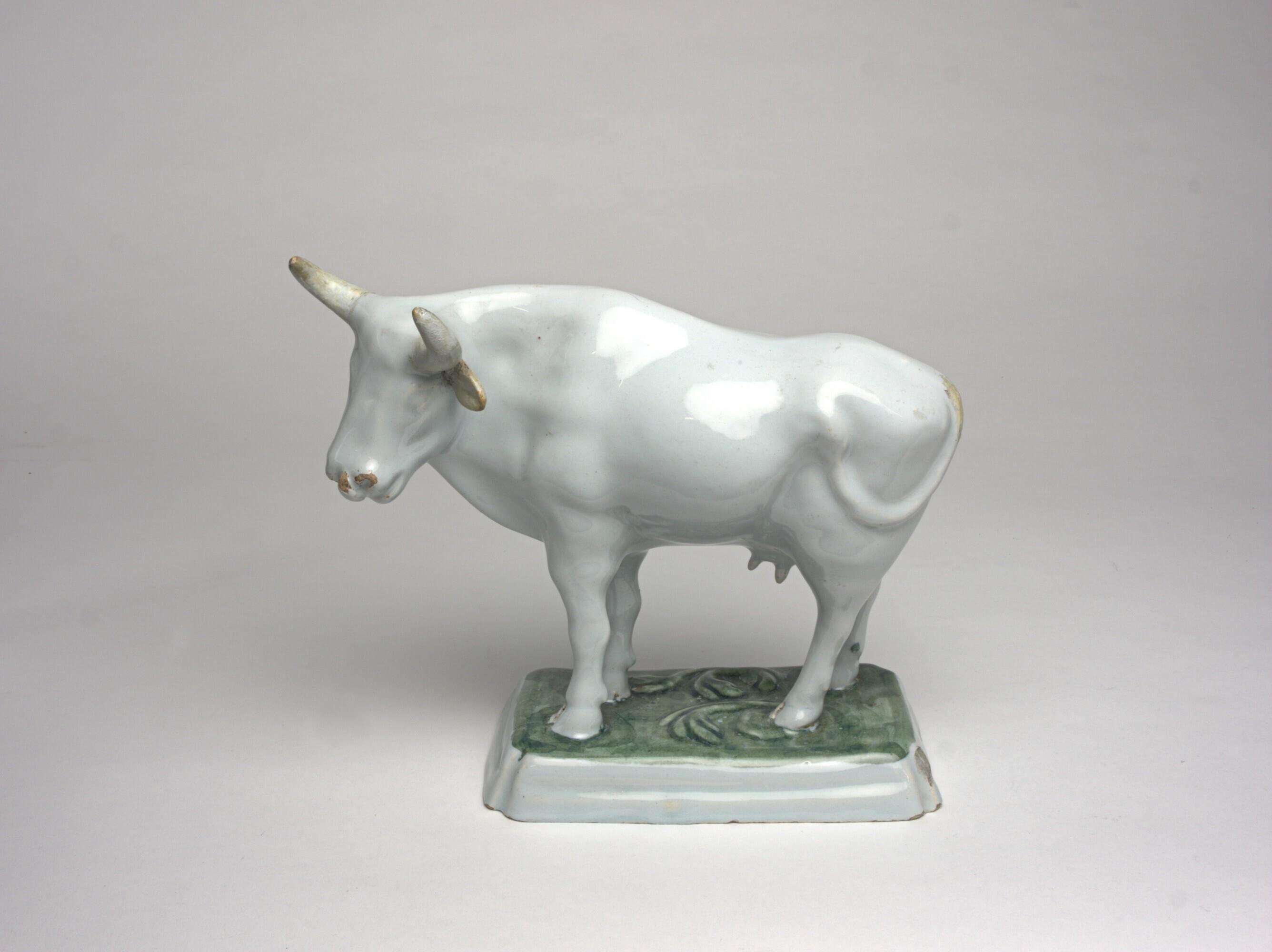 Plastiek van tinglazuuraardewerk, voorstellende een koe