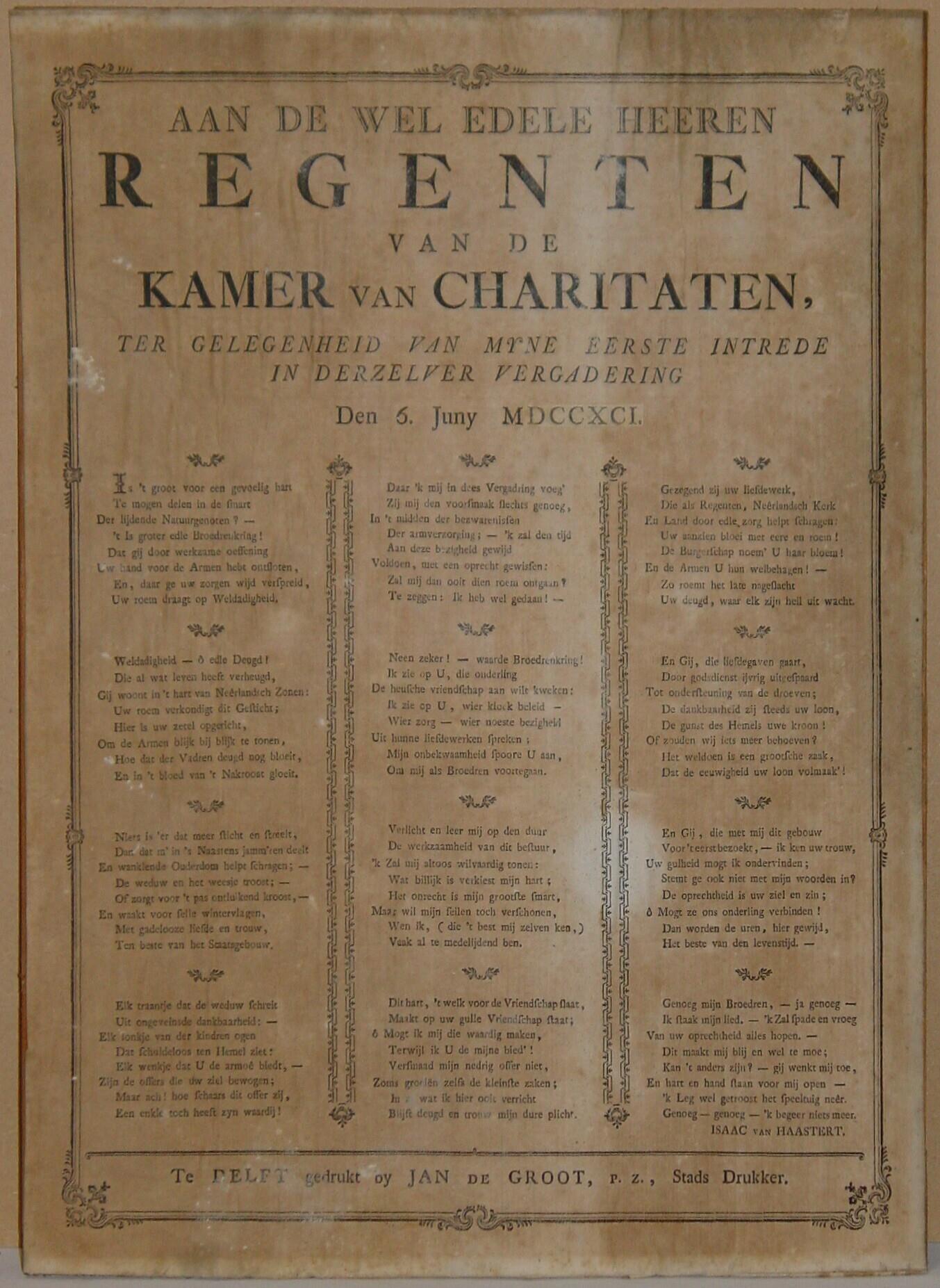 'Aan de Wel Edele Heeren Regenten van de Kamer van Charitaten ter gelegenheid van mijne eerste intrede in derzelver vergadering'
