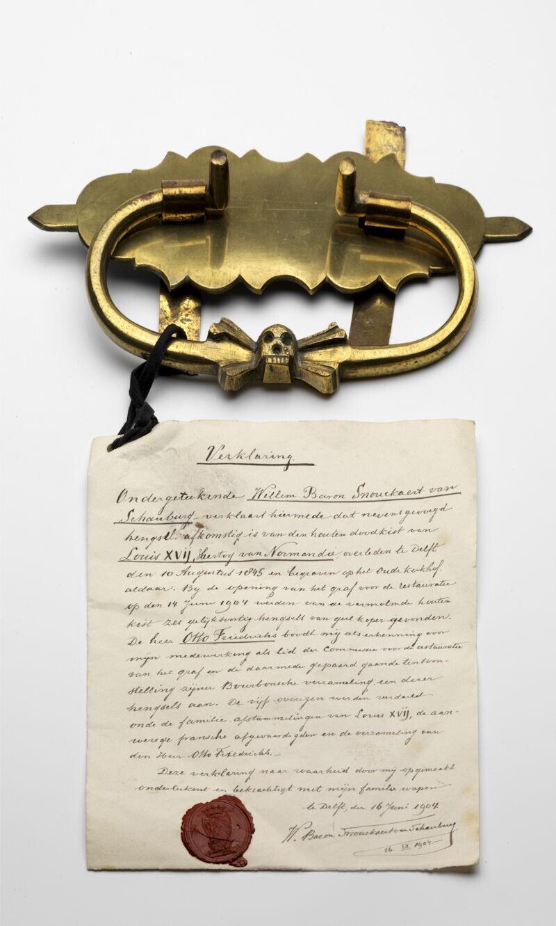 Hengsel van de doodskist van Karl Wilhelm Naundorff (c. 1785 – 1845), met echtheidsverklaring
