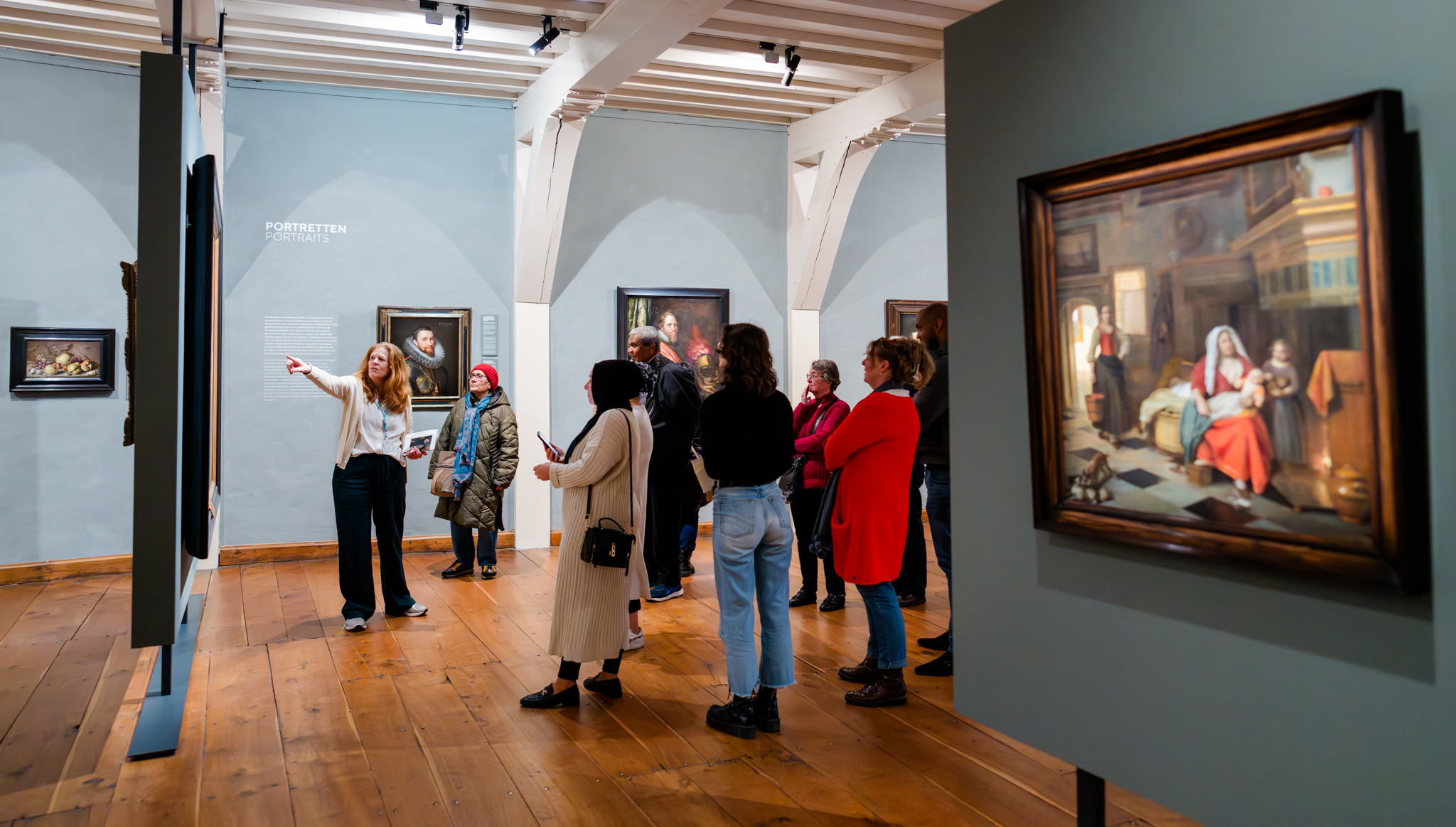 Groep deelnemers, kunstenaar en sociale partner in gesprek in Museum Prinsenhof Delft, 2024. Foto: Marco De Swart