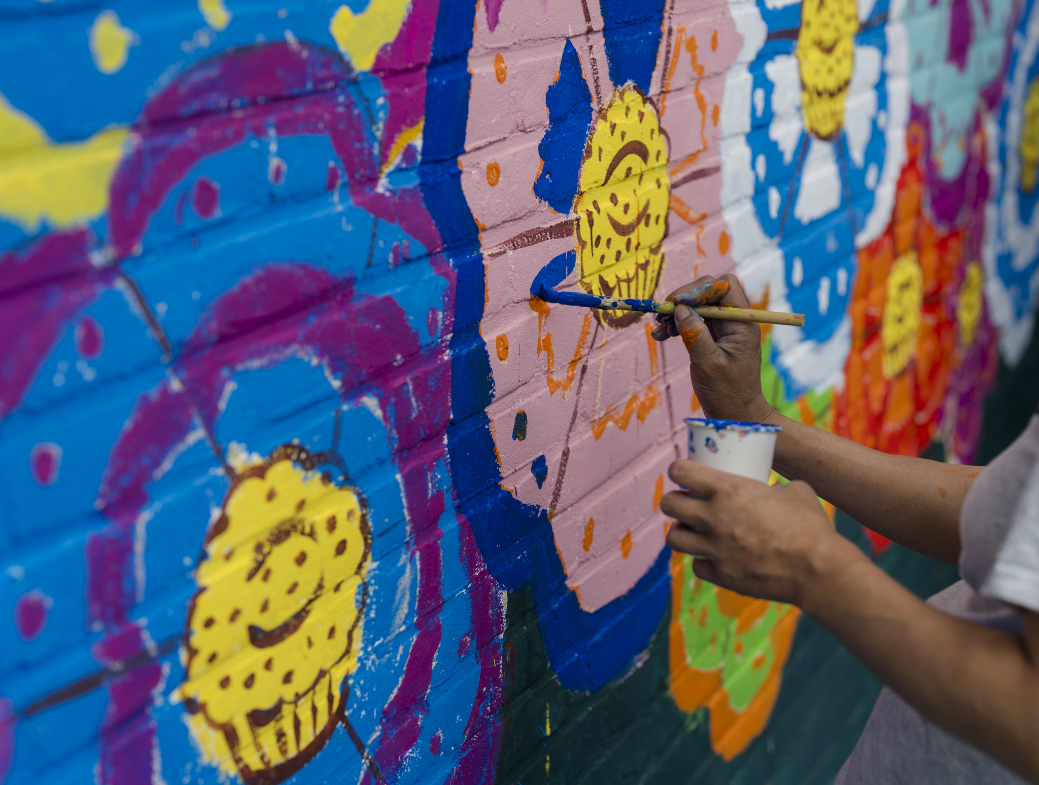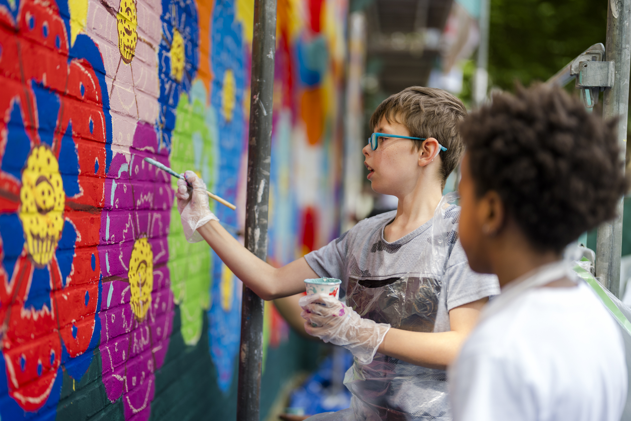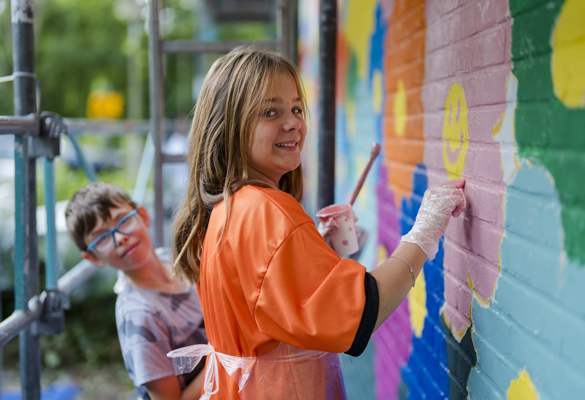 De werkzaamheden zijn inmiddels gestart. Vrijdag 8 augustus hebben kinderen uit de week enthousiast geholpen met het schilderen van een zee vol bloemen op de muur van de Bachflat.