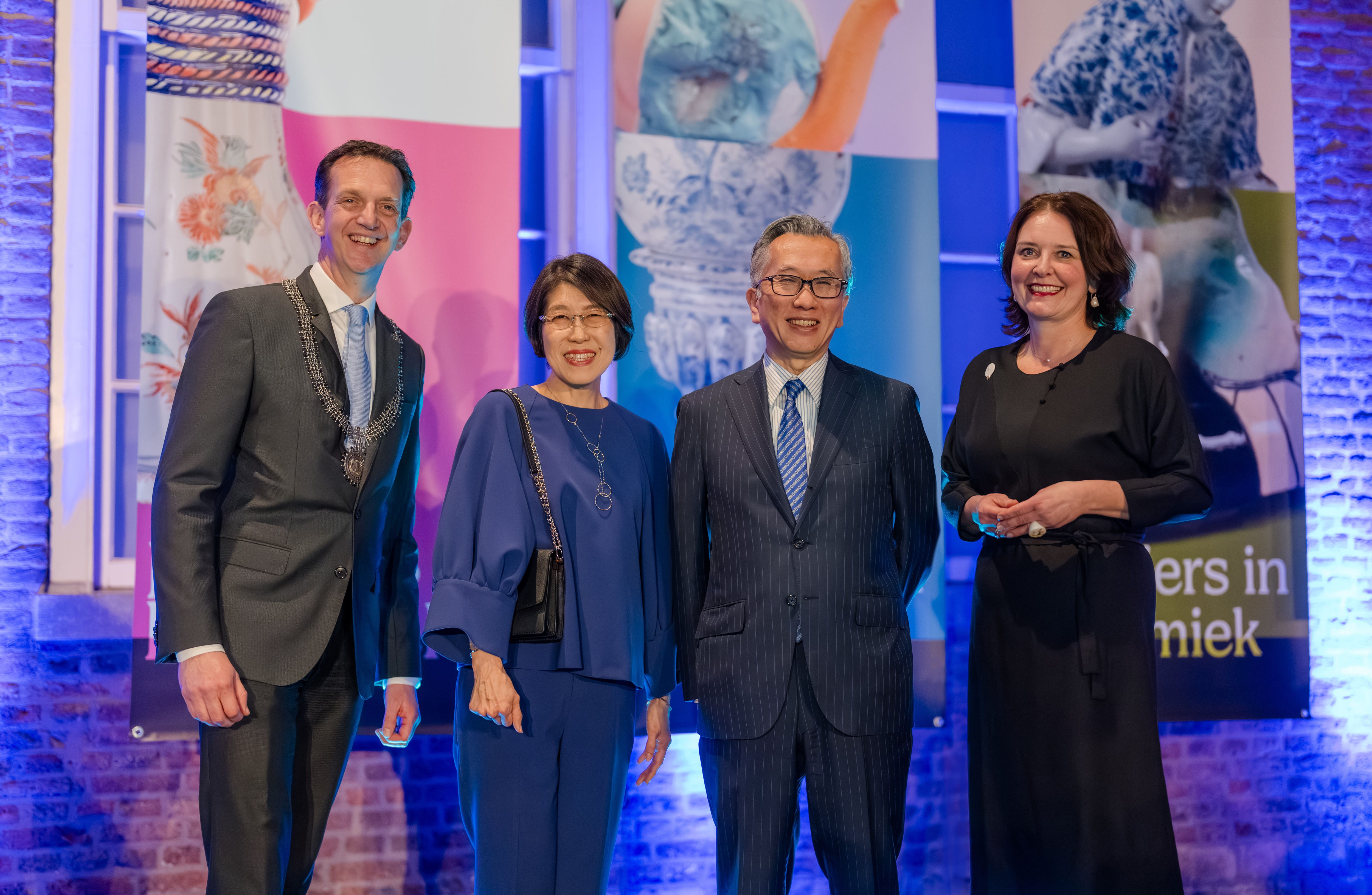 vlnr: wethouder Frank van Vliet, mevrouw Misao MINAMI, ambassadeur van Japan Zijne Excellentie de heer Hiroshi MINAMI, directeur Museum Prinsenhof Delft Janelle Moerman