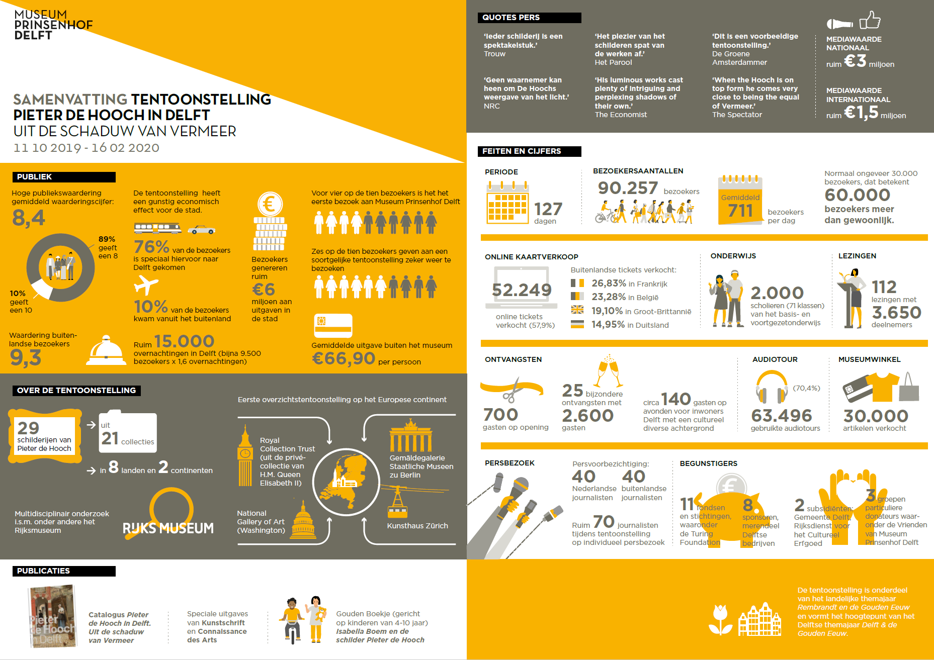 “De afgelopen maanden trokken maar liefst 90.000 bezoekers uit binnen- en buitenland naar Delft voor de eerste overzichtstentoonstelling in Nederland over Pieter de Hooch. Naast de unaniem lovende recensies in de nationale en internationale media ontving het museum talloze positieve reacties van individuele bezoekers. Met de expositie hebben we Pieter de Hooch niet alleen het podium kunnen bieden dat hij verdient: hij is nu ook onlosmakelijk met Delft verbonden en hiermee definitief uit de schaduw van Vermeer getreden.”