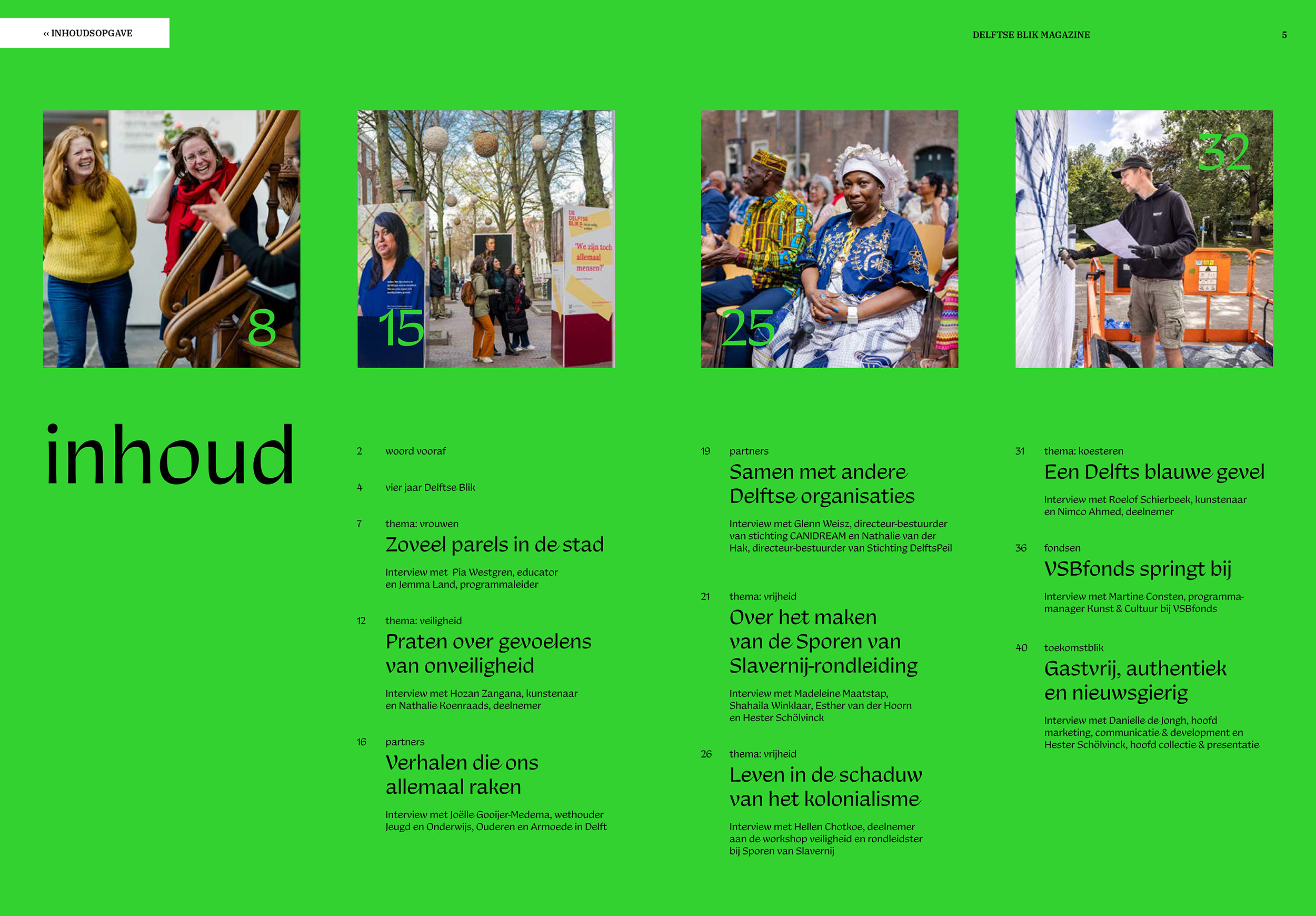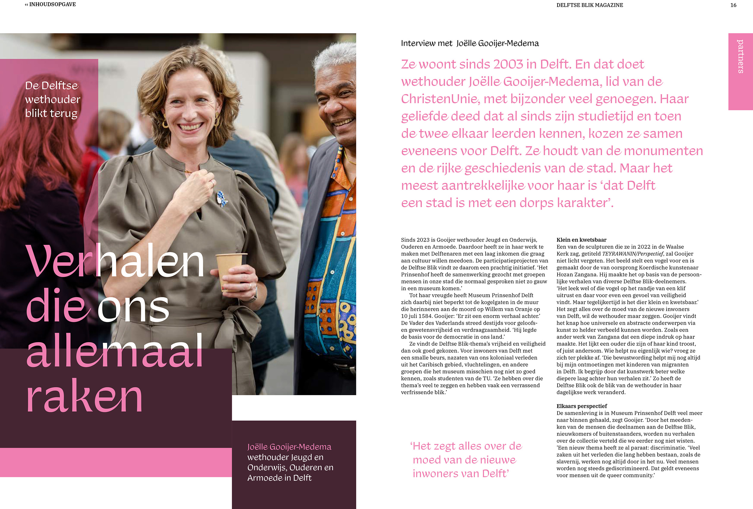 Het magazine vier jaar Delftse Blik is uit! Met gepaste trots presenteren dit verzamelexemplaar boordevol inspirerende interviews, bijzondere foto’s en persoonlijke verhalen van stadsgenoten, kunstenaars en medewerkers die tussen 2020 en 2024 hebben deelgenomen aan het Delftse Blik programma.